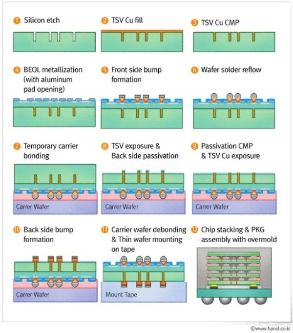 TSV란 기존 와이어를 이용해 칩을 연결하는 대신 칩에 미세한 구멍을 뚫어 상단 칩과 하단 칩을 전극으로 연결하는 미세한 구멍을 뚫어 칩 상하단의 구멍을 전극으로 연결하는 패키징 기술입니다. 칩을 적층해 대용량을 구현하는 기술로, 기존 금선(와이어)을 이용해 칩을 연결하는 와이어 본딩(Wire Bonding) 기술보다 속도와 소비전력을 크게 개선할 수 있는 것이 특징입니다.