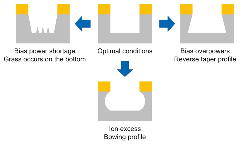 즉, 동일 RF Power에서 각 Parameter를 조절할 시 TSV Profile은 아래와 같이 변화합니다. 따라서 Physical Etch와 Chemical Etch의 비율을 잘 조절하여 원하는 TSV Profile을 만드는 것이 중요합니다.