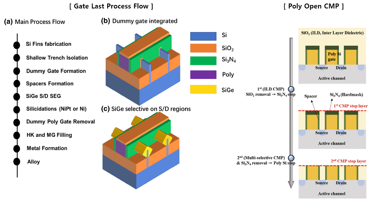 Removal Poly Gate (RPG) 공정은 Gate Last 공정에서 새롭게 도입된 방식입니다. Metal Gate를 형성하기 전에 amorphous 실리콘으로 Dummy Gate를 먼저 만들어 주는 구조이며, 이후 Source/Drain을 형성하고 Poly Open CMP 공정을 통해 상부의 Nitride를 제거한 뒤, Dummy Gate 내부의 amorphous Si을 제거하고 Metal Gate를 형성하게 됩니다. 이와 같은 Gate Last 방식은 고온 Source/Drain Anneal 이후에 게이트를 형성하기 때문에 기존 Gate First 방식에 비해 고온 공정으로부터 Hi-K/Metal Gate을 보호할 수 있어, 공정 안정성과 성능 면에서 장점을 갖고 있습니다.