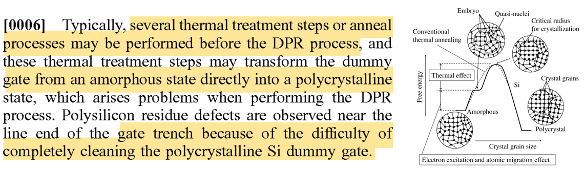 다른 논문에서는 Dummy Gate 형성 후 Source/Drain 공정 중 높은 온도(700-1000°C)로 인해 Amorphous Si에서 Poly-Crystalline Si으로 변하면서, Etch Rate이 감소하여 Poly residue가 발생할 수 있다고 소개하였습니다. 아래는 해당 문제를 인지하고 해결하는 방법에 대한 특허 중 일부를 발췌하였습니다 (US20180033874A1, UMC).