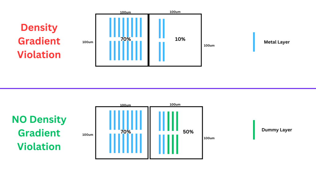 대표적인 방법으로는 Pattern Density를 Design Rule로 설정하는 것이 있습니다. 예를 들어, Pattern Density가 50% 이상이어야 한다는 Design Rule을 적용하면, 첫 번째 사례처럼 Pattern Density가 50% 미만인 영역은 Rule 위반으로 판정됩니다. 설계적으로 Pattern Density를 늘리기 어렵다면 전기적으로 연결되지 않는 Dummy Pattern을 삽입하여 Design Rule을 만족할 수 있습니다. 이처럼 Pattern Density를 Design Rule을 설정함으로써 공정 환경을 균일하게 유지할 수 있습니다.
