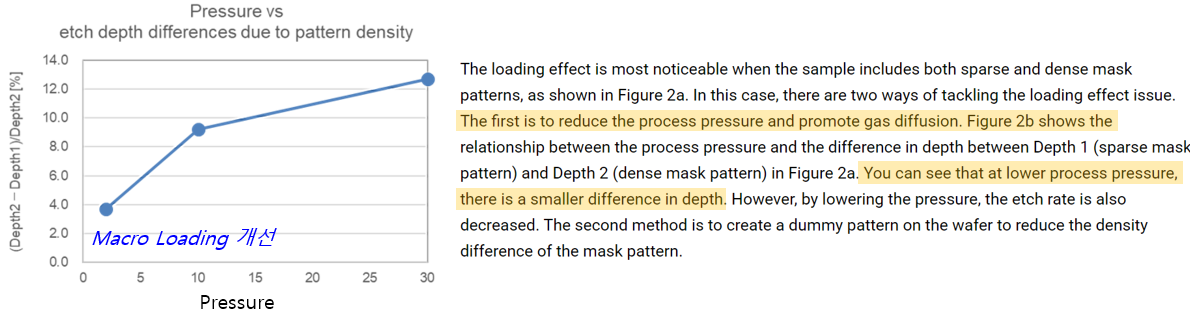 Macro Loading은 칩(Wafer) 내에서 Pattern Density에 따라 식각 속도가 달라지는 현상으로, Pattern Density가 높은 영역에서는 Radical이 빠르게 소모되어 상대적으로 부족해지고, 그 결과 식각 속도가 낮아집니다.