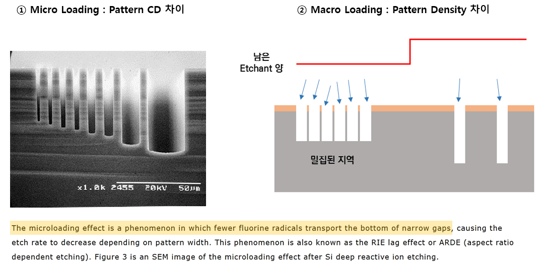 Loading Effect는 발생 원인에 따라 두 가지로 구분할 수 있습니다. Micro Loading은 패턴의 CD에 따라 식각 정도가 달라지는 현상으로, 패턴의 CD가 좁을수록 라디칼이 내부까지 침투하기 어렵고 반응 부산물(by-product)의 배출도 제한되어 식각 속도가 감소합니다.
