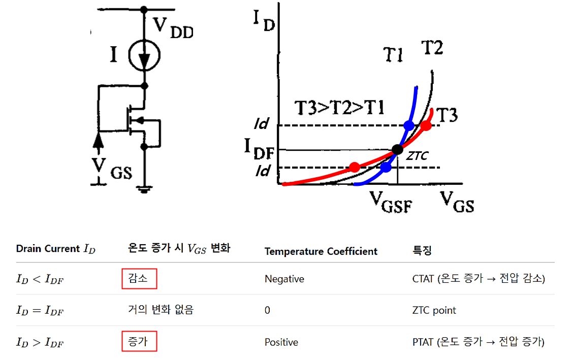 회로를 간단히 설명하면, MOS 트랜지스터의 Gate와 Drain이 연결된 diode-connected 구조이며, 트랜지스터에는 일정한 전류원이 흐르도록 바이어스되어 있습니다. 이때 전류의 크기가 ZTC에서의 전류 IDF 보다 큰지 또는 작은지에 따라 온도에 따른 Vgs의 변화 경향이 달라집니다.