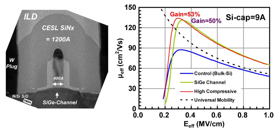 ① PMOS Hole Mobility Enhancement Through SiGe Conductive Channel and Highly Compressive ILD-SINx Stressing Layer