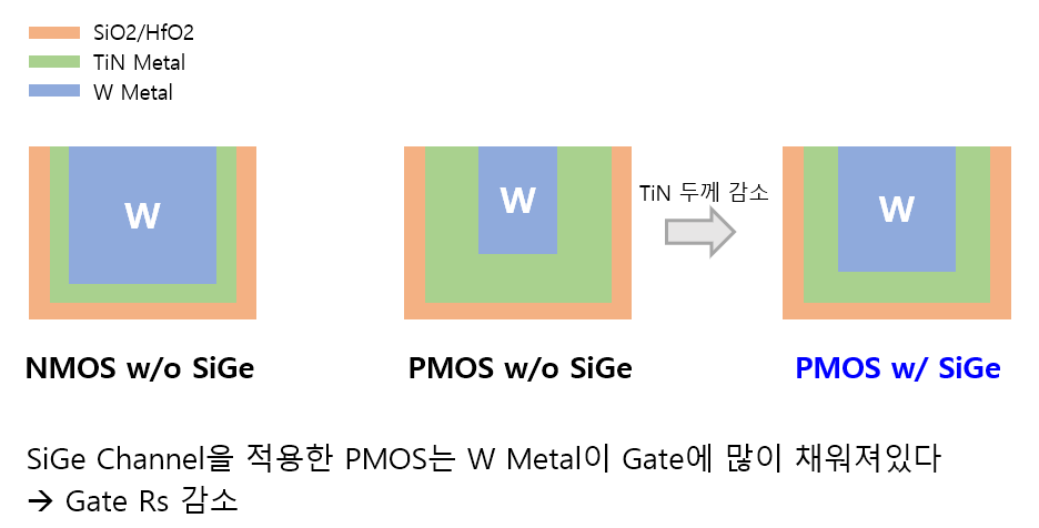 NMOS, PMOS 의 Gate 두께 차이는 초기에는 문제가 없었지만 MOSFET → FinFET → MBCFET(GAA)로 구조 변화 및 Gate Length가 줄어들면서 문제가 발생하고 있습니다. 먼저 두께를 무한정 높일 수 없습니다. GAA 구조에서는 TiN 두께를 높이는 것이 매우 제한적입니다. 또한 Gate Length 감소에 따라 TiN 두께가 두꺼울수록 Gate 저항(Rs)가 열화되게 됩니다. 따라서 SiGe Channel을 통해 PMOS의 TiN 두께를 감소시킬 수 있다면 구조에서 오는 문제를 해결할 수 있고 Gate Rs를 개선할 수 있습니다.
